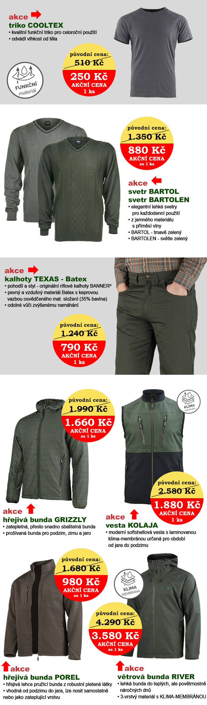 Některé akční nabídky mohou být platné souběžně v našich firemních prodejnách i v e-shopu, ale některé pouze jen v prodejnách (např. malosériově vyráběné kolekce oděvů, či sezónní oděvy). Naopak některé akční nabídky najdete pouze v e-shopu (položky s menší skladovou zásobou, nebo doprodej posledních kusů).